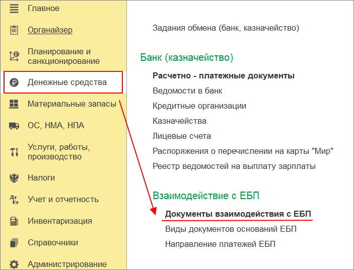 - Загрузка документа Поступление на счет в БУ/АУ реализована в программе в разделе Денежные средства - Взаимодействие с ЕБП - Документы взаимодействия с ЕБП