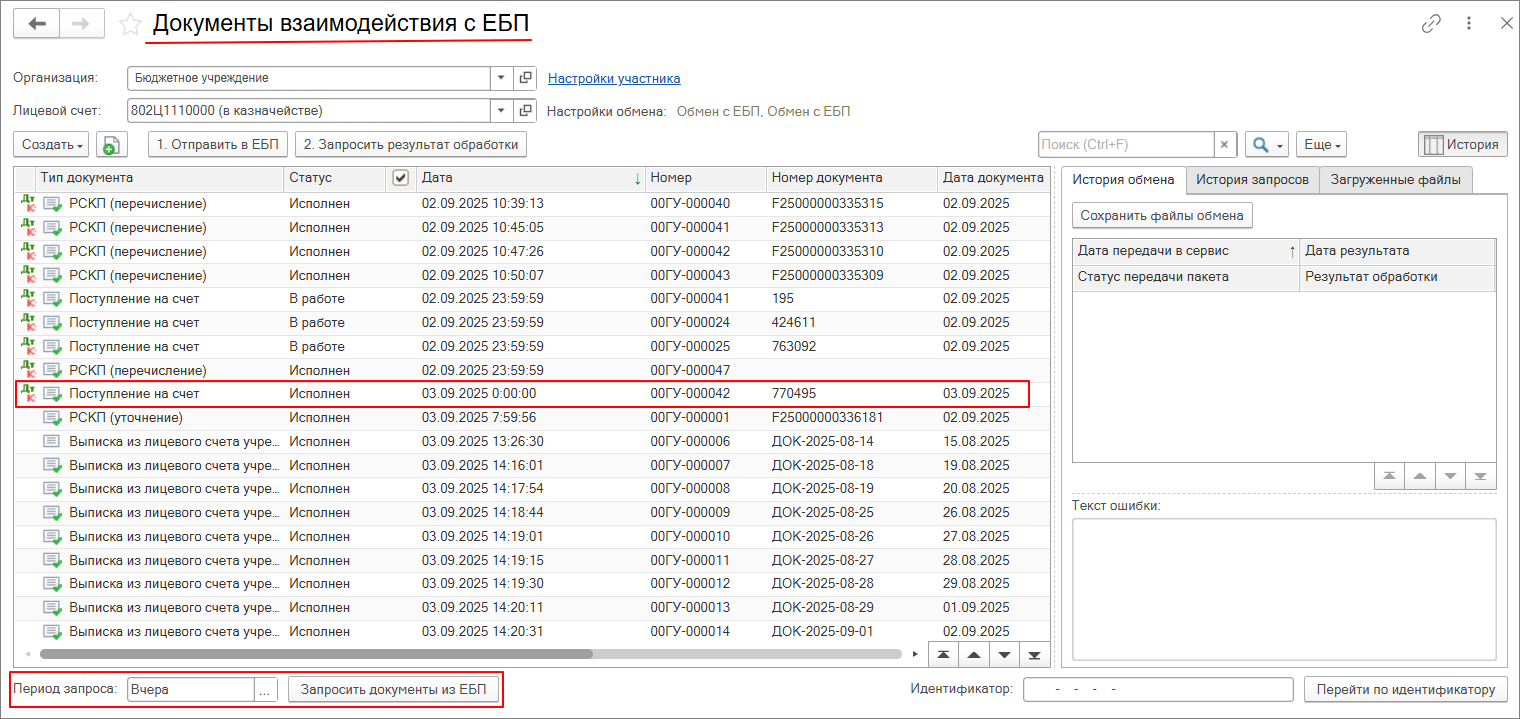 - Документ Поступление на счет загружается с помощью кнопки Запросить документы из ЕБП
