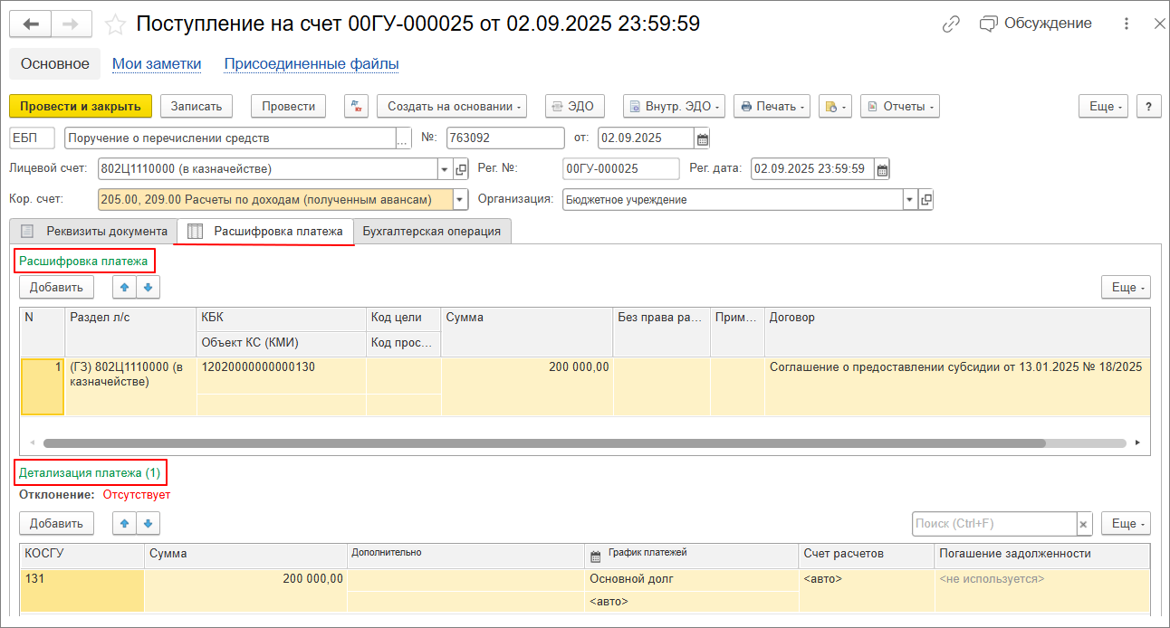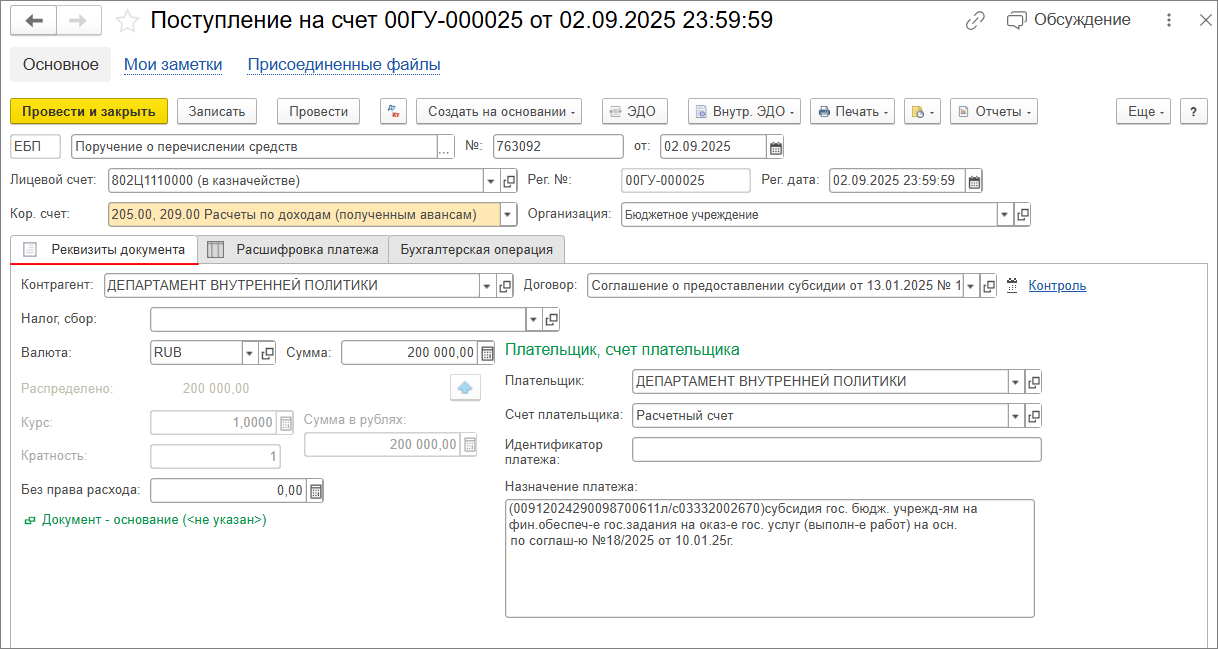 - Контрагент — загружается из Единой бюджетной платформы, при необходимости можно изменить на контрагента из справочника Контрагенты;