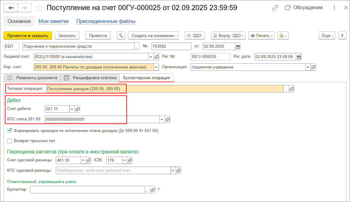 - На закладке Бухгалтерская операция указывается типовая операция и заполняется Счет и КПС дебета.