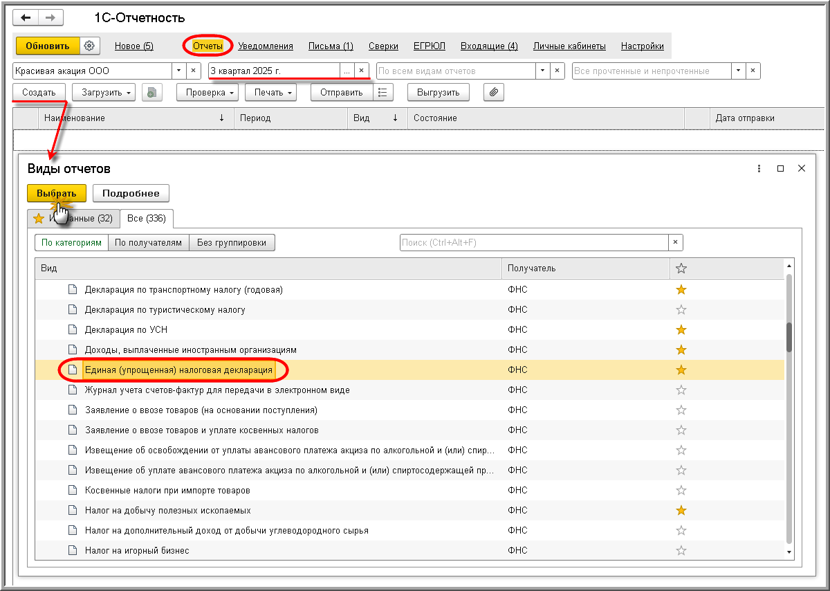 Для составления единой (упрощенной) налоговой декларации в 1С:Бухгалтерии 8 необходимо в форме «1С-Отчетность» нажать на кнопку «Создать», в форме «Виды отчетов» найти отчет с названием «Единая (упрощенная) налоговая декларация» и нажать на кнопку «Выбрать». Если декларация в программе составляется впервые, то отчет выбирается на закладке «Все» в группе отчетов «Налоговая отчетность».