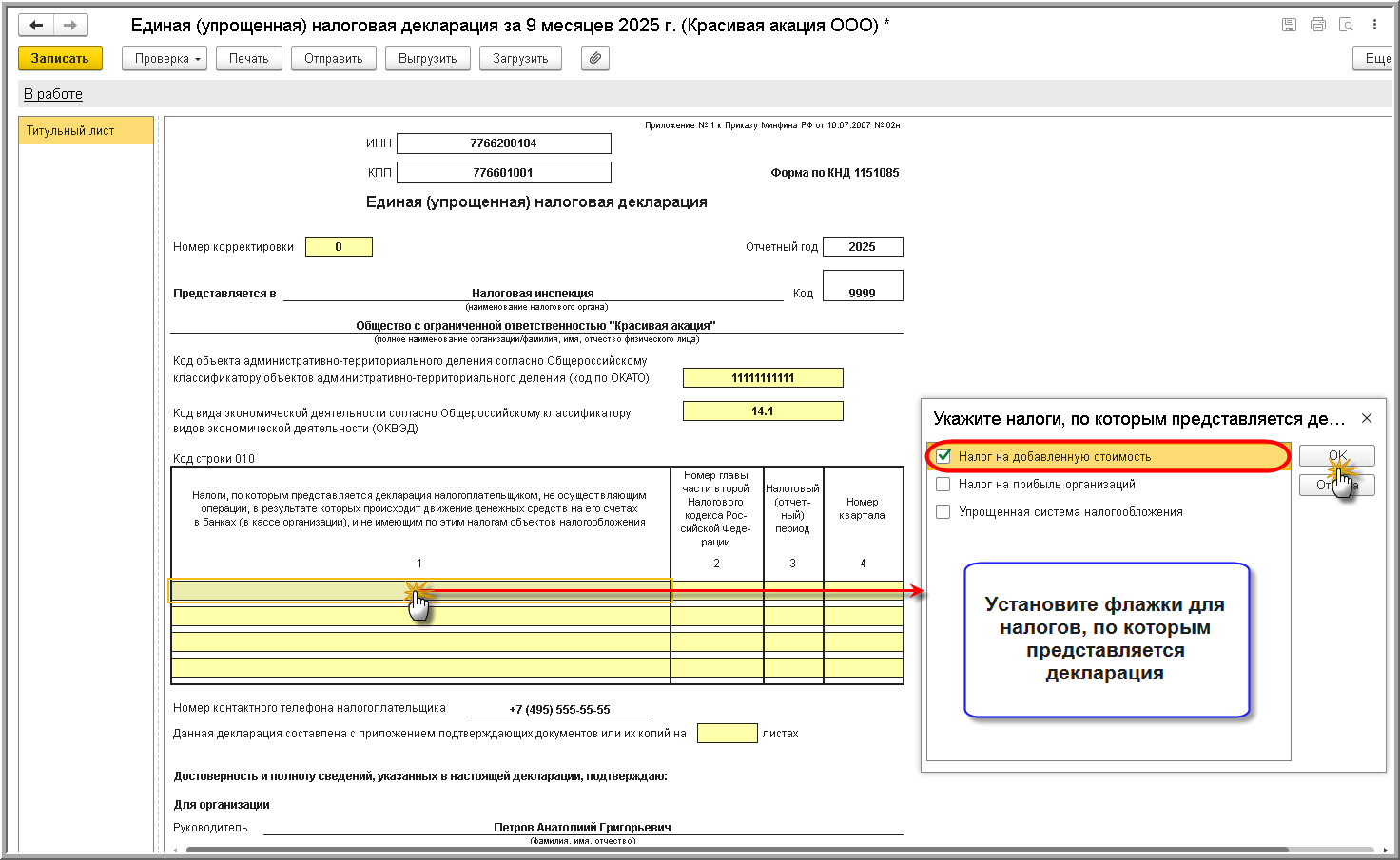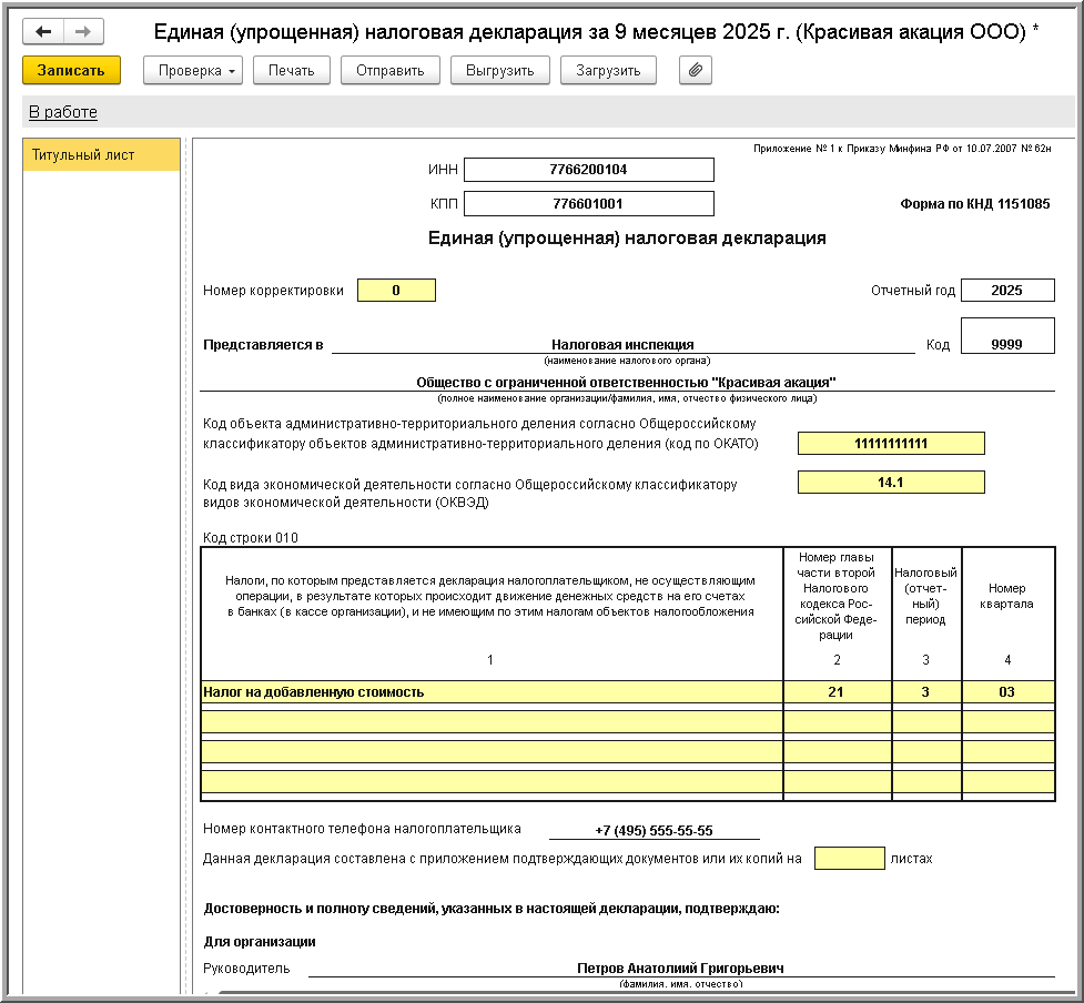 В программе 1С:Бухгалтерия 8 используется регламентированный отчет «Единая (упрощенная) налоговая декларация». Ниже приведен пример оформления.