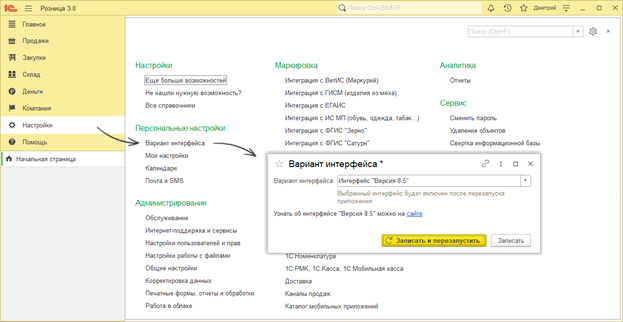 - Переход на 8.5 — ручной. Для этого необходимо зайти в Настройки → Персональные настройки → Вариант интерфейса и выбрать «Интерфейс версия 8.5», затем нажать «Записать и перезапустить».