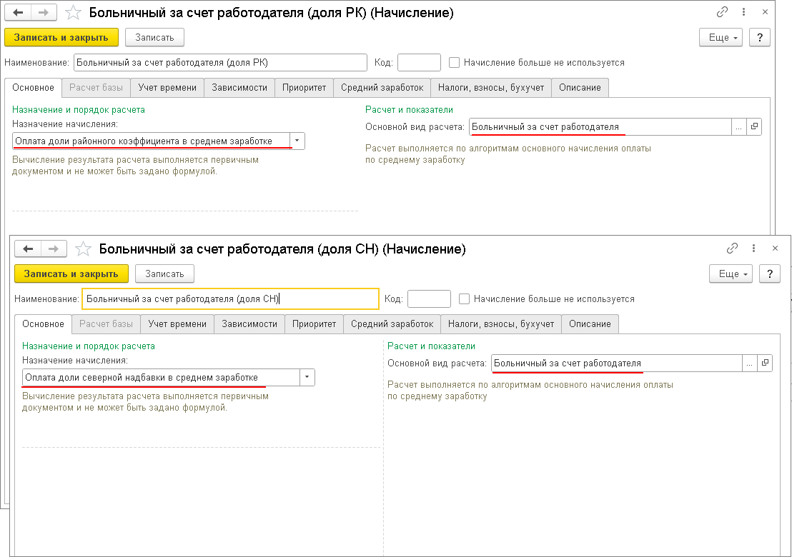 - в форме настроек этих начислений в поле Основной вид расчета ввести с клавиатуры наименование соответствующего основного начисления (например, Больничный за счет работодателя);