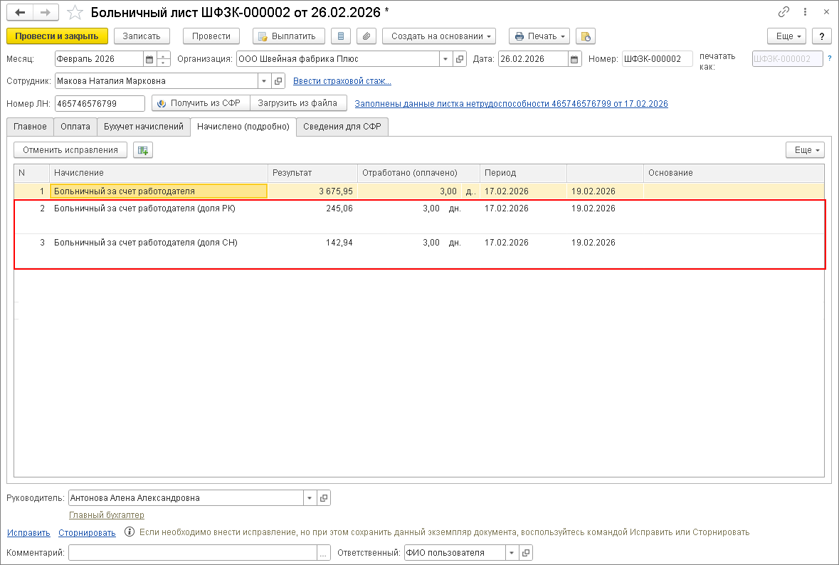 - После этого при выполнении очередных расчетов начисления Больничный за счет работодателя будут выделены доли РК и СН.
