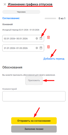 - Реализована возможность переноса отпуска по графику – сотрудник может отправить заявление на изменение дат непосредственно из своего календаря отпусков. Данную функцию нужно отдельно включать в настройках.