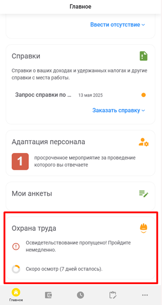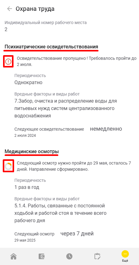 В этом разделе вы можете получать информацию о ваших медосмотрах и психиатрических освидетельствованиях (если назначены), в том числе: вредные факторы и виды ваших работ, требующих медосмотров, дату пройденного/пропущенного и следующего медосмотра. Также вы можете посмотреть информацию о номере своего рабочего места и присвоенного ему класса условий труда.
