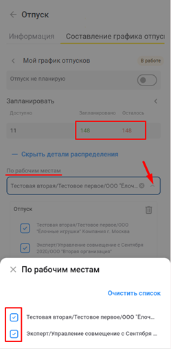 - Сотрудник видит точное количество доступных дней по каждому виду отпуска и по каждой организации (если работает в нескольких).