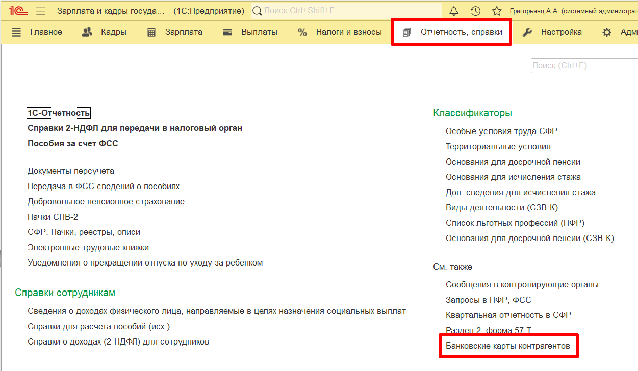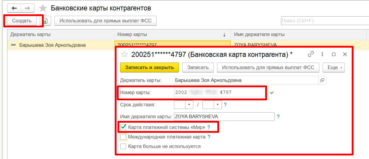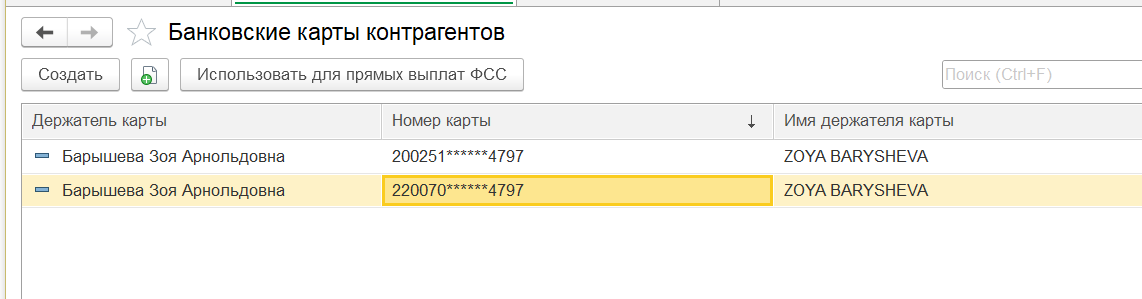 Предварительно соберите у сотрудников номера карт МИР. После этого откройте справочник «Банковские карты сотрудников» и создайте или актуализируйте записи.