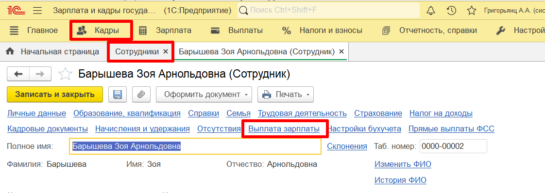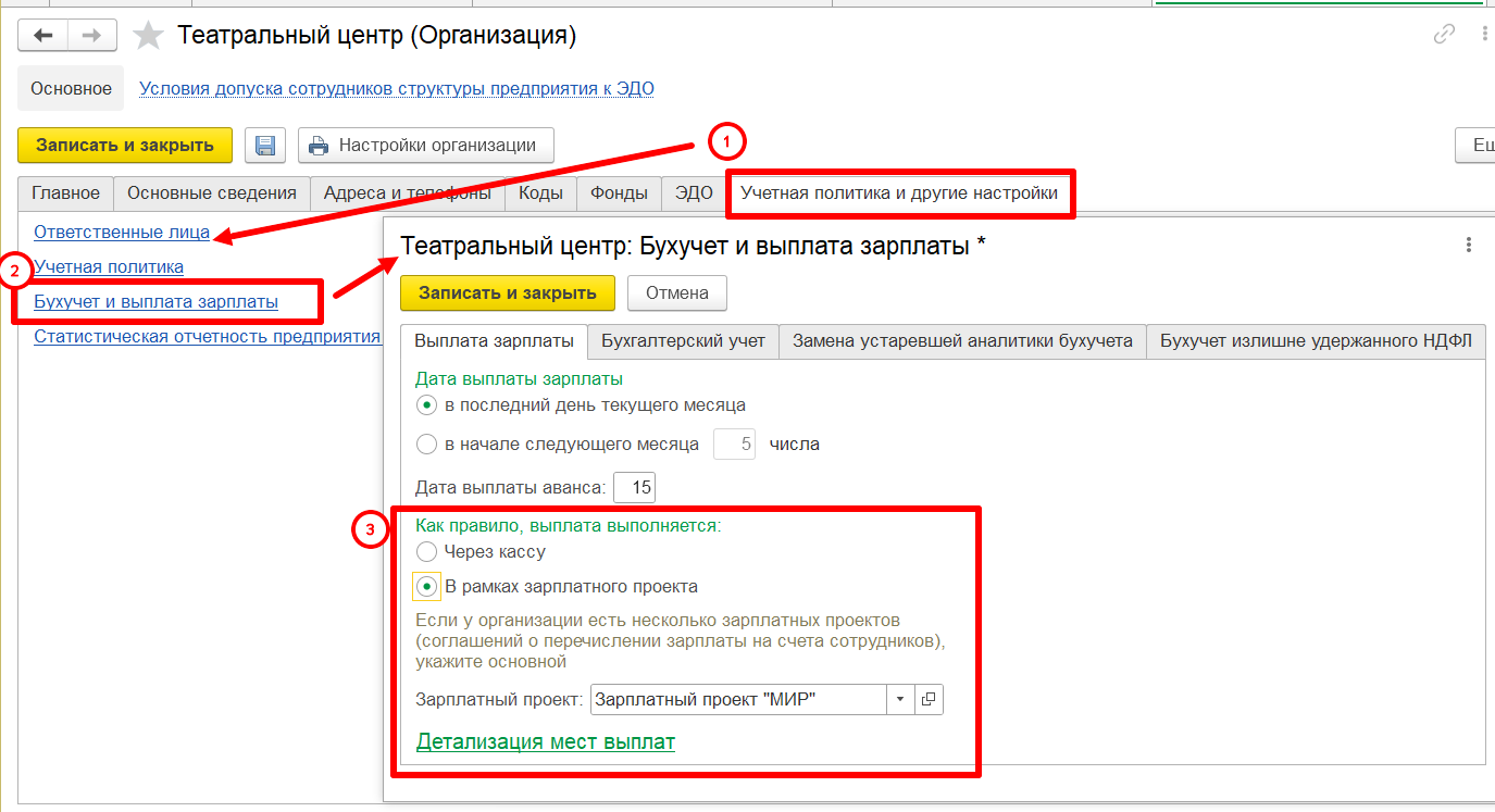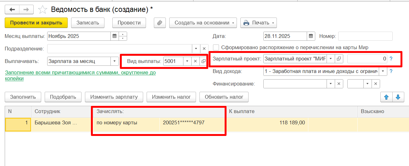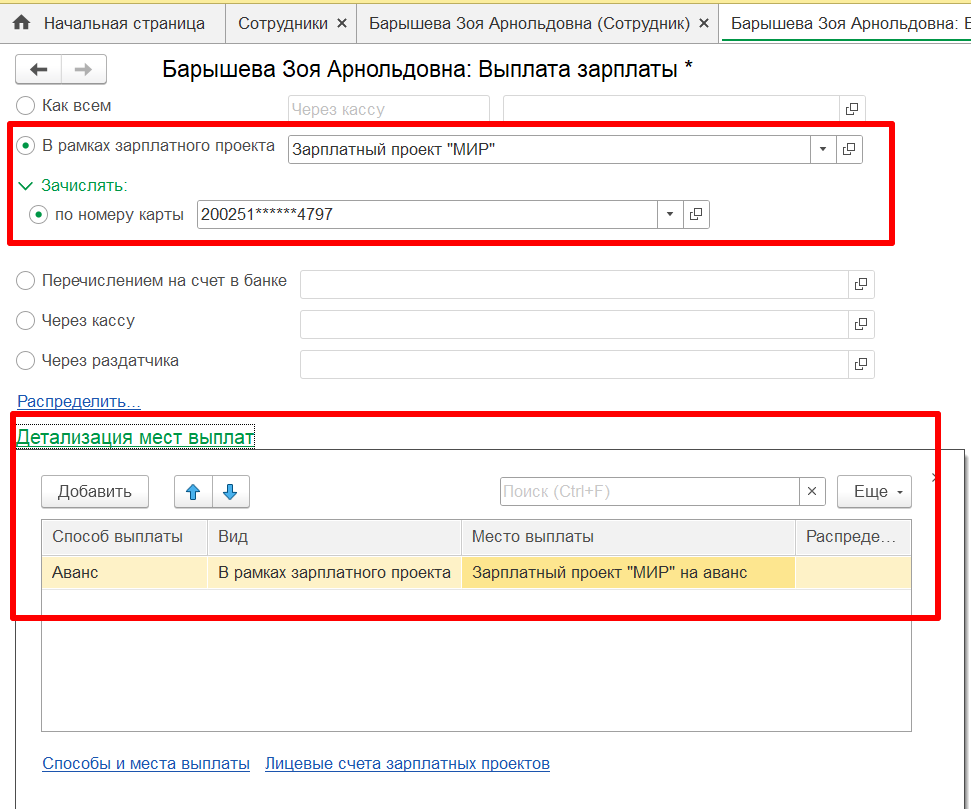 Откройте карточку каждого сотрудника и укажите созданный зарплатный проект и соответствующую карту МИР.