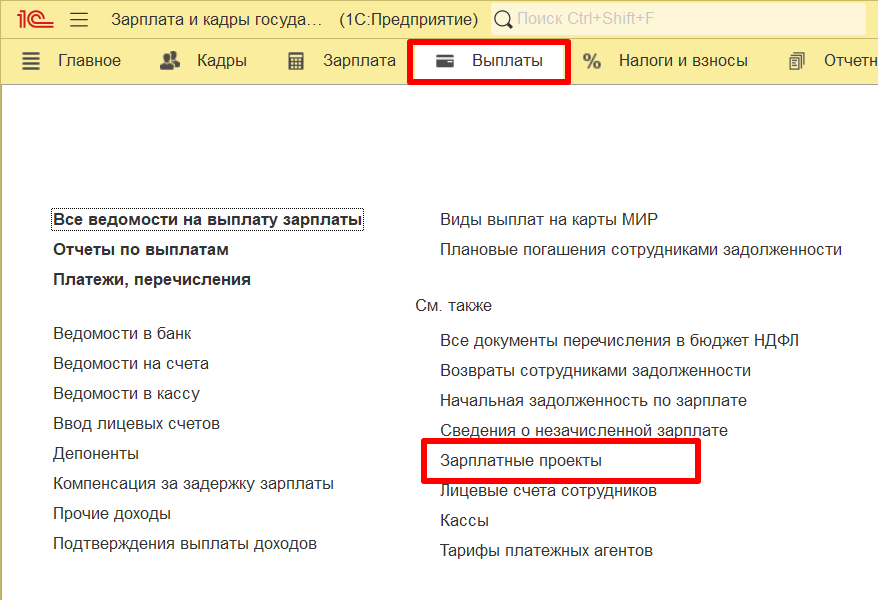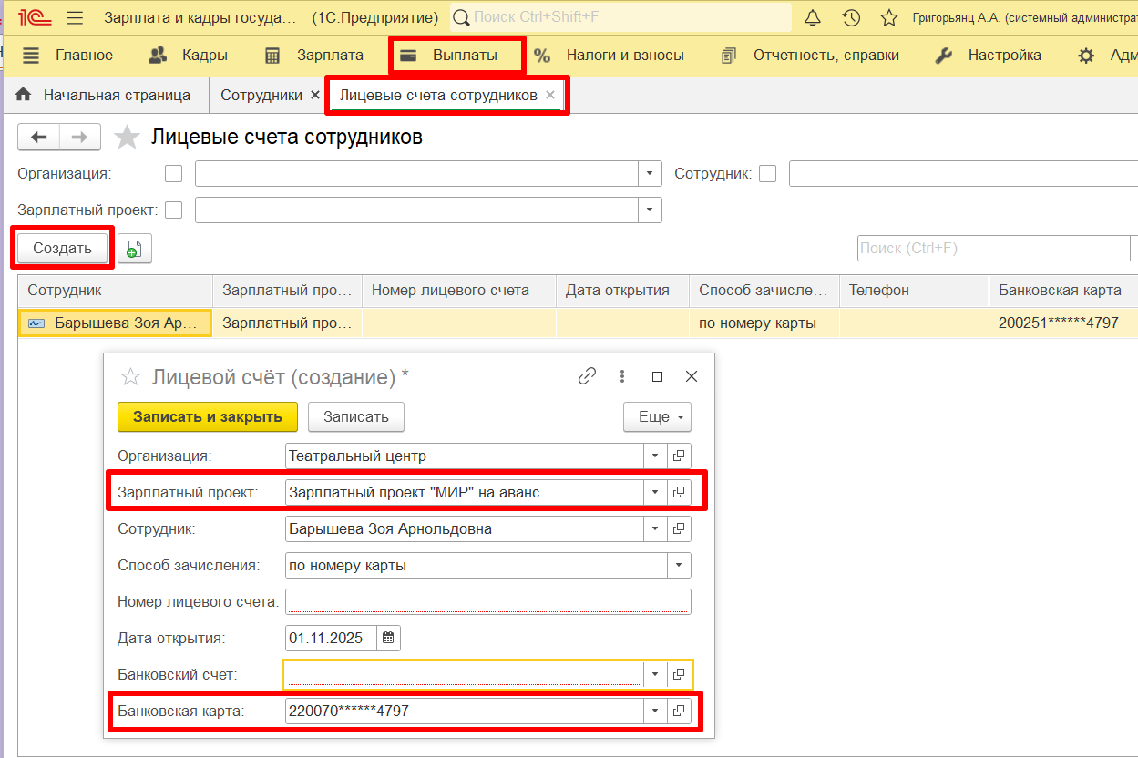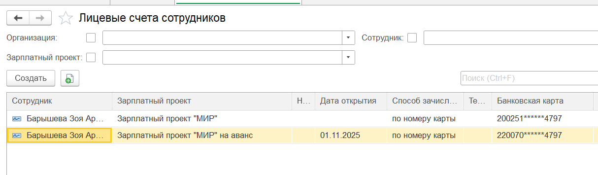 Перейдите в раздел «Выплаты» — «Лицевые счета сотрудников» и создайте привязку номера карты МИР к соответствующему зарплатному проекту для каждого сотрудника.