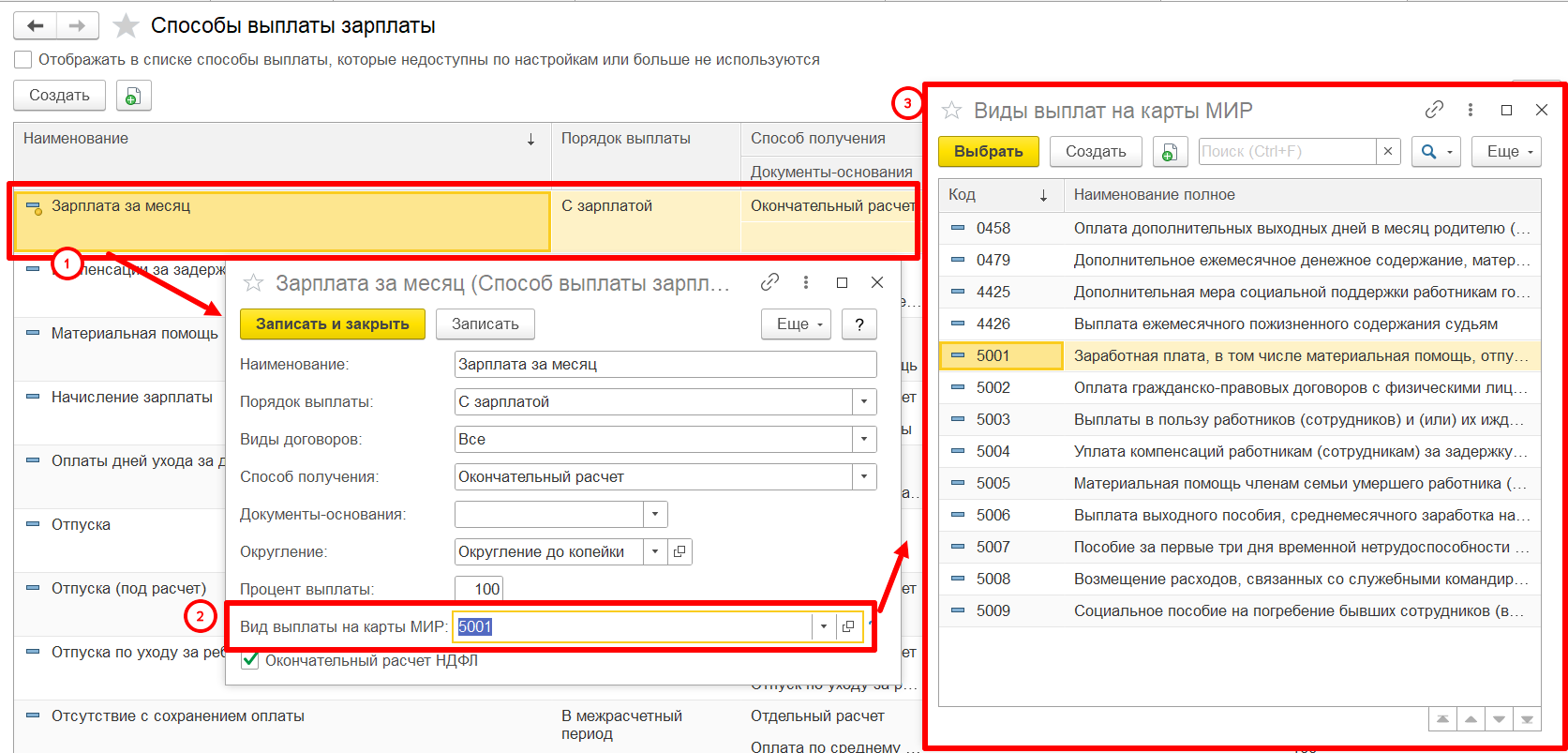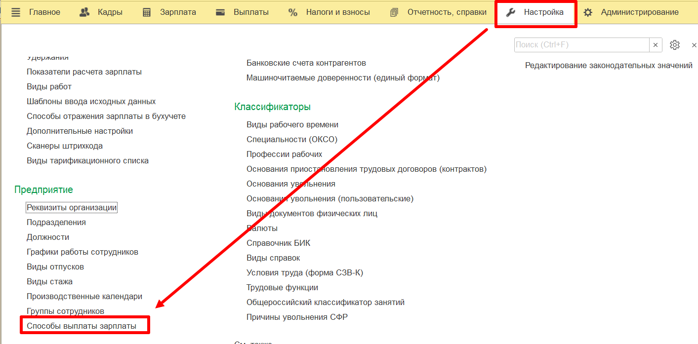 В разделе «Настройки» откройте справочник «Способы выплаты зарплаты» и настройте способы в соответствии с видами выплат на карты МИР.