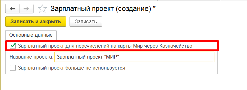 В справочнике «Зарплатные проекты» создайте новый проект и установите флажок «Зарплатный проект на перечисление на карты МИР через казначейство».