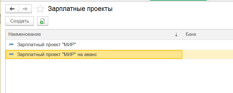 Раздельные карты для аванса и зарплаты. Если сотрудник хочет получать аванс на одну карту МИР, а зарплату — на другую, создайте два отдельных зарплатных проекта. Например: «Зарплатный проект МИР» и «Зарплатный проект МИР — Аванс».