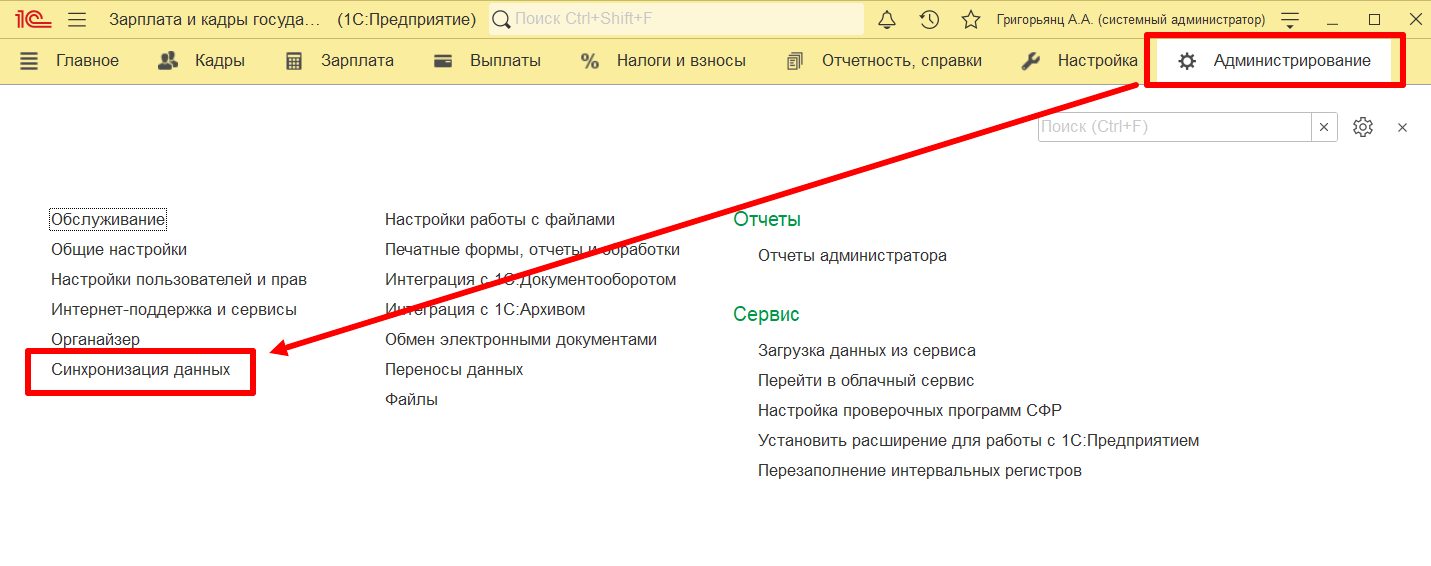 Перейдите в Администрирование — Синхронизация данных — Настройки синхронизации — Синхронизировать.