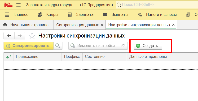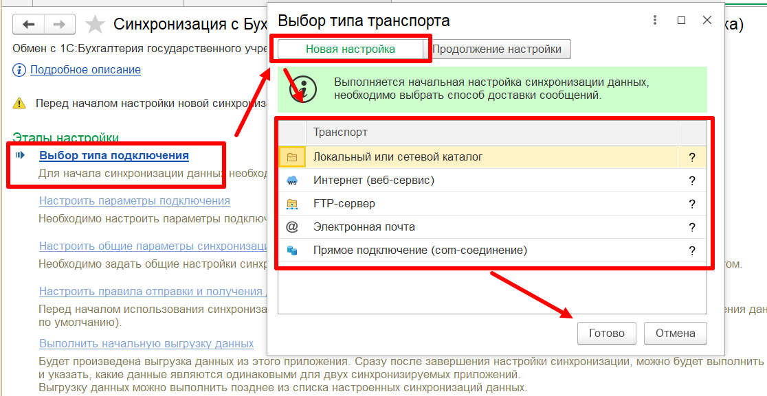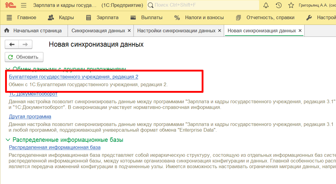 Откройте Помощник создания обмена данными по кнопке «Создать» в разделе «Настройки синхронизации данных». В открывшемся списке выберите «Бухгалтерия государственного учреждения, редакция 2.0».