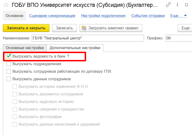 - На вкладке «Дополнительные настройки» установите флажок «Выгружать ведомость в банк».