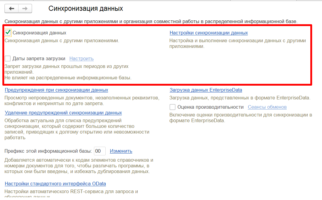 Перейдите в раздел Администрирование — Синхронизация данных. В настройках конфигурации установите флажок использования обмена и задайте префикс информационной базы.