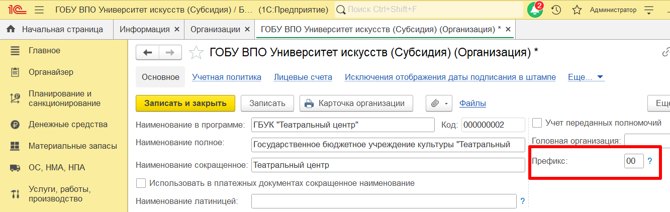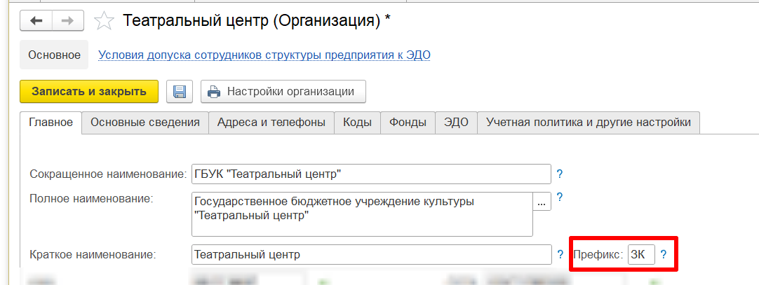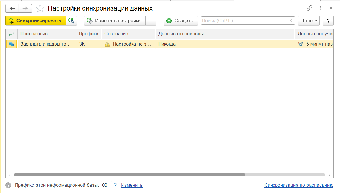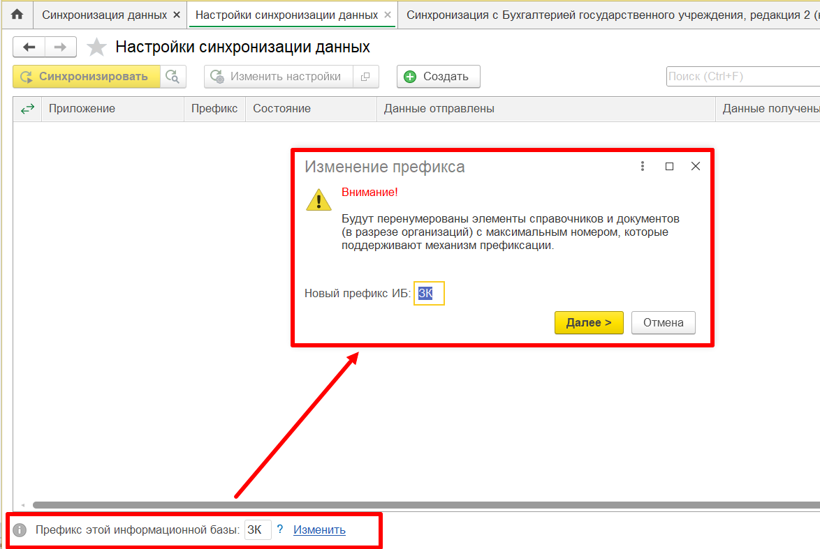 Если в программах ранее не было префиксов, их необходимо установить — либо в настройках организации, либо при включении синхронизации. Учитывайте: при создании префикса все документы перенумеруются. Вместо «0000» в начале номера появится значение вида «Префикс00» (например, «ЗК00-000001»).