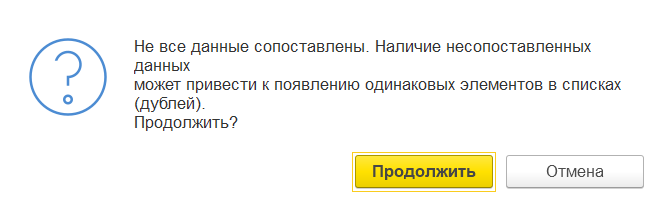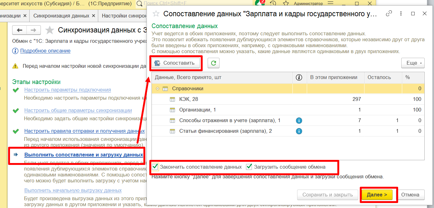 После этого выполните сопоставление данных. Завершив его, установите флажки «Закончить сопоставление данных» и «Загрузить сообщение обмена». Элементы, которые не удалось сопоставить вручную, загрузятся автоматически из базы-корреспондента.