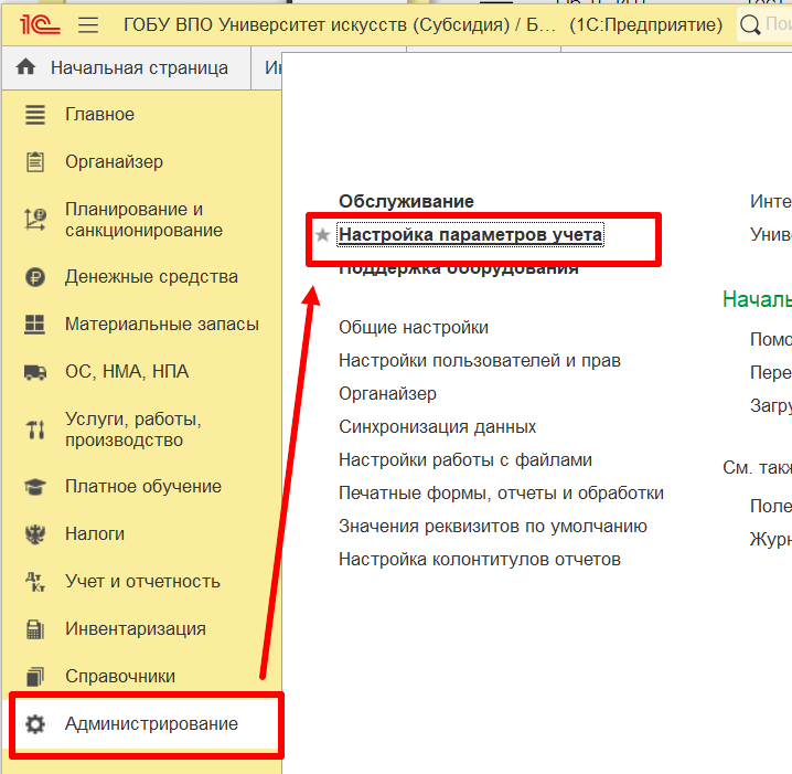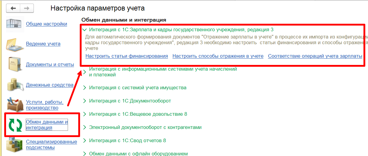 Перейдите в Администрирование — Настройка параметров учёта — Обмен данными и интеграция — Настроить способы отражения в учёте.