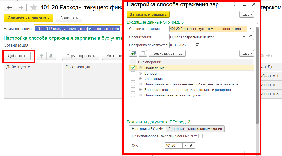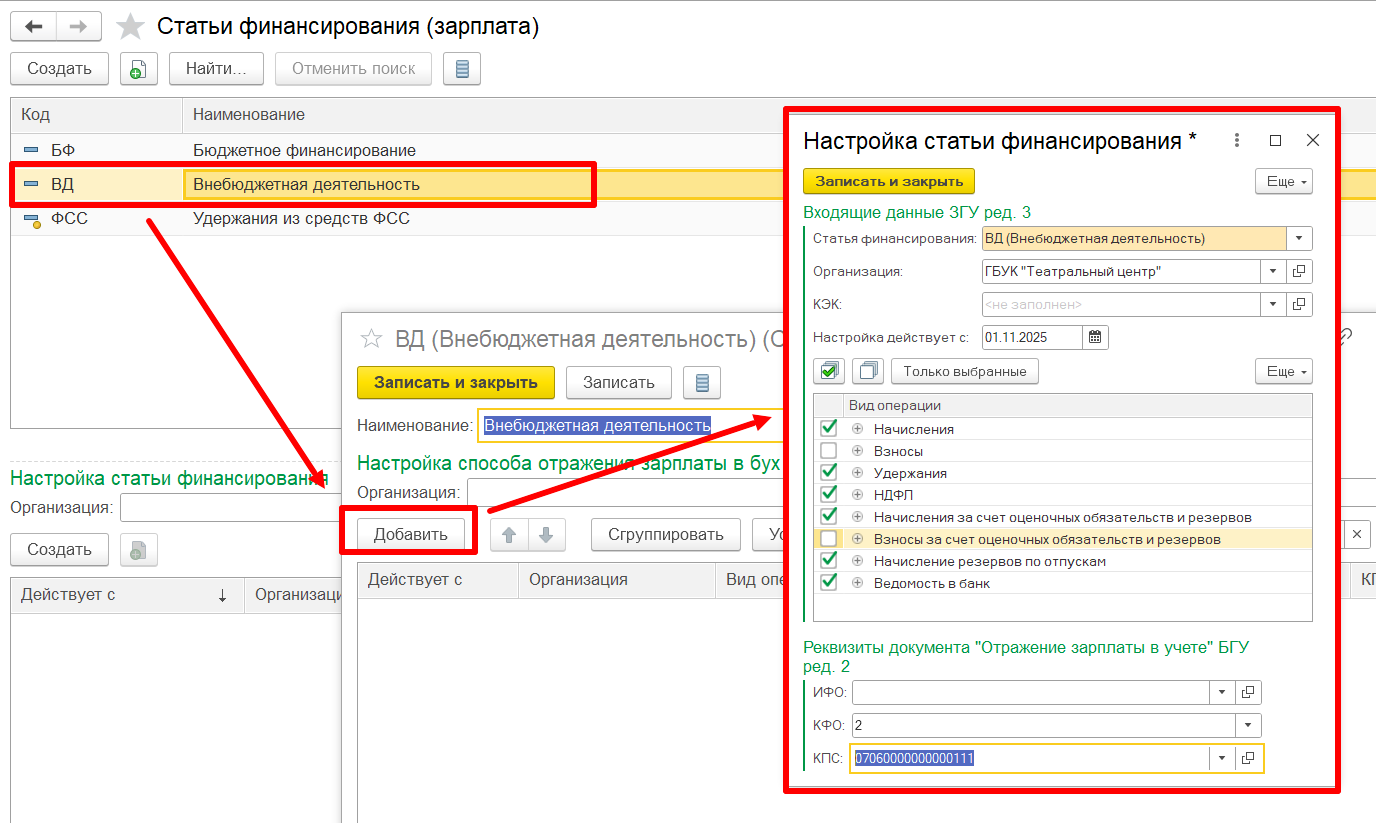 Шаг 3. Настройка статей финансирования и способов отражения зарплаты в 1С:БГУ
