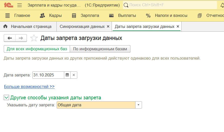 Здесь же укажите дату запрета загрузки — рекомендуется обновлять её каждый раз после закрытия месяца.